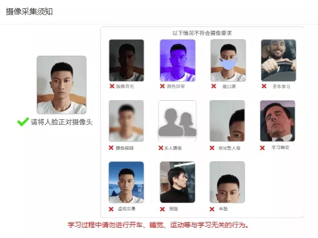 响摄像头对人脸的识别,保证摄像头拍摄到人脸完整性,具体的摄像采集要求详见下图。一旦发现非本人学习、学习过程中无抓拍照片,或出现挂播、拖动等造成照